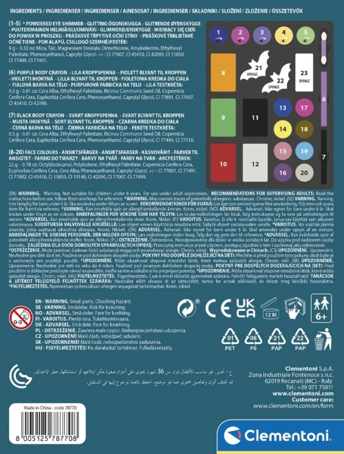 Z tym zestawem do malowania twarzy marki Clementoni dzieci będą się świetnie bawić i rozwijać swoją kreatywność. Otwórz pudełko, a czeka na Ciebie przejrzyście uporządkowana paleta ze wszystkimi niezbędnymi elementami do bezpiecznego i radosnego makijażu.