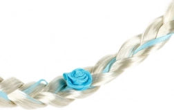 Elegancki blond warkocz przeplatany jasnoniebieską wstążką i kwiatuszkami doda kostiumowi delikatności i baśniowego sznytu.