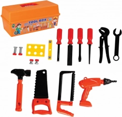 • Zestaw 34-elementowy: wiertarka, śrubokręt, piła, klucz, młotek, szczypce i różne elementy łączące.