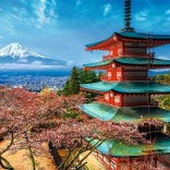 Pagoda wśród kwitnących sakur z górą FUJI w tle łączy harmonię architektury i natury – motyw, który nie znudzi się nawet po ułożeniu.