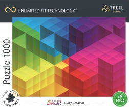Odkryj nieskończone układanie z puzzlami TREFL UFT Color Splash z motywem kostkowego gradientu, 1000 elementów. Dzięki technologii Unlimited Fit Technology poszczególne motywy można dowolnie łączyć w większe kolaże. Puzzle wykonano z solidnego niebieskiego kartonu, każdy element ma unikalny kształt, a ułożony obraz można łatwo przenieść bez rozsypywania. Ekologiczne bio opakowanie bez folii plastikowej ucieszy wszystkich, którzy dbają o planetę.