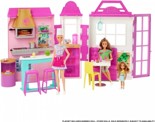 Przeżyj mnóstwo zabawy w nowoczesnej restauracji BARBIE z ponad 30 elementami akcesoriów, 6 strefami zabawy i lalką w kucharskim stroju. Dzieci mogą przyjmować zamówienia, usadzać gości, grillować burgery, piec pizzę zmieniającą kolor i serwować desery na obrotowym blacie – to wszystko w jednym stylowym zestawie.