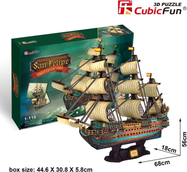 3D puzzle żaglowca San Felipe marki CubicFun oferują realistyczny model historycznej galiony z bogatymi zdobieniami i dopracowanymi detalami pokładu. Elementy z pianki o grubości ok. 3 mm, pokrytej laminowanym zadrukowanym papierem, precyzyjnie do siebie pasują, zapewniając stabilny i atrakcyjny efekt bez użycia kleju czy nożyczek.