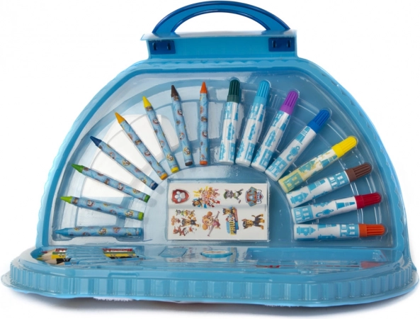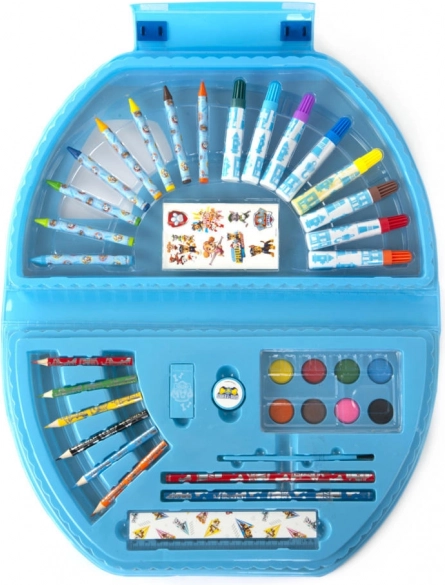 Metalowa walizeczka do malowania Psi Patrol – zawiera flamastry, kredki woskowe, kredki ołówkowe, farby akwarelowe, ołówki, linijkę, gumkę, temperówkę, pędzelek oraz naklejki.