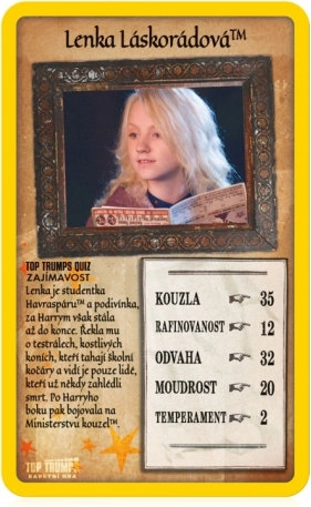 Zanurz się w piątym roku w Hogwarcie dzięki Top Trumps z edycji Harry Potter i Zakon Feniksa. W talii znajdziesz ulubionych bohaterów i złoczyńców – od Harry’ego, Rona i Hermiony po profesor Umbridge, Bellatrix Lestrange i Lucjusza Malfoya. Każda karta ma swoje atrybuty, które decydują, kto jest najodważniejszy, najbystrzejszy lub najpodlejszy.