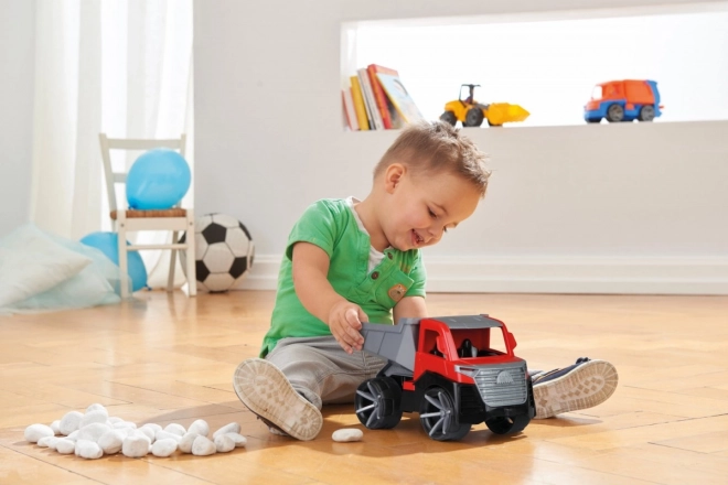 Wywrotowa skrzynia wyposażona jest w zabezpieczającą blokadę, która zapobiega niechcianemu wysypaniu ładunku – idealne do realistycznej zabawy na budowie.