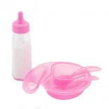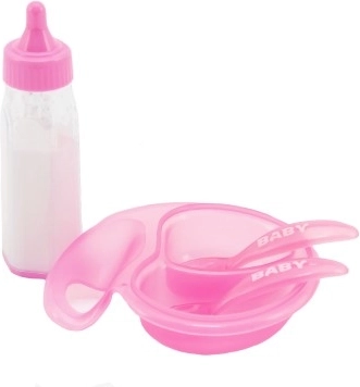 Ten zestaw dla lalek to idealny dodatek dla każdej małej opiekunki. Przygotuj pyszne dania w miseczce i podawaj je swojej lalce przy użyciu dołączonej łyżeczki i widelczyka. Obserwuj, jak mleko w butelce 'znika', gdy dajesz lalkę pić, i znów się pojawia, gdy butelkę odwrócisz. Ten zestaw zapewnia godziny zabawy i wspiera rozwój małej motoryki i troskę o innych.