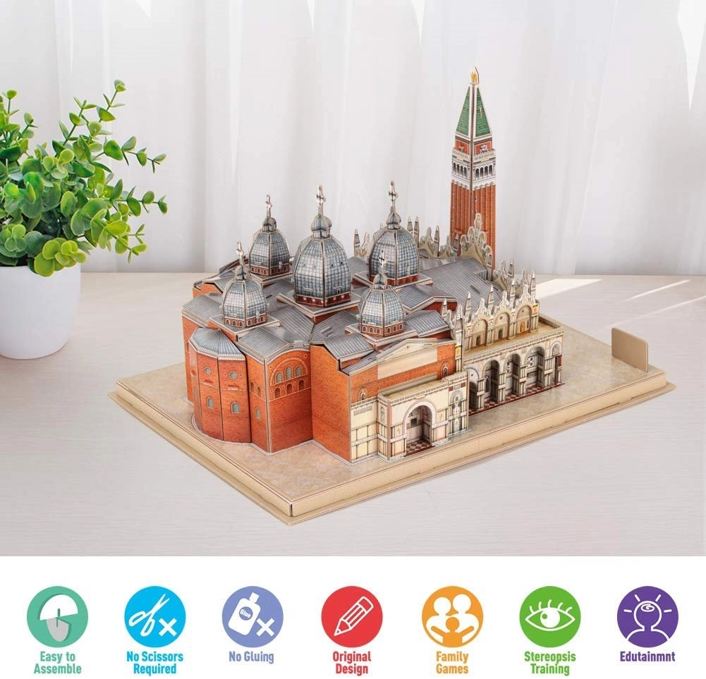 Odkryj urok Wenecji dzięki szczegółowej makiecie Placu Świętego Marka. Puzzle 3D CUBICFUN z edycji National Geographic wykonano ze specjalnej wielowarstwowej pianki pokrytej laminowanym, zadrukowanym papierem, co gwarantuje piękne kolory i długą żywotność. Elementy są wstępnie nacięte – wystarczy je łatwo wyłamać i złożyć zgodnie z instrukcją.