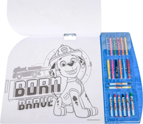 Ten uniwersalny zestaw kreatywny ucieszy wszystkich małych artystów. Dzięki połączeniu kredek woskowych, flamastrów i kredek dzieci wypróbują różne techniki kolorowania i rysowania, a naklejki oraz szablony pomogą im łatwo tworzyć oryginalne obrazki z ulubionymi bohaterami z Psi Patrol.