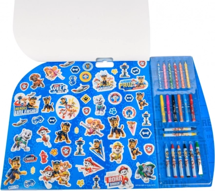 Odkryj zestaw do malowania 5 w 1 z motywem Psi Patrol, który oferuje dzieciom 8 kredek woskowych, 6 flamastrów, 6 kredek, arkusz z 84 naklejkami, 15 szablonów i czyste kartki. Idealny do rozwijania kreatywności i motoryki małej w domu i w podróży.