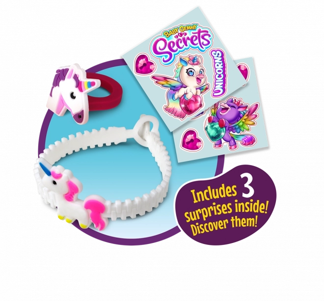 - 1× pluszowy jednorożec Baby Gemmy, 1× bransoletka z niespodzianką, 1× pierścionek z niespodzianką, 1× naklejki