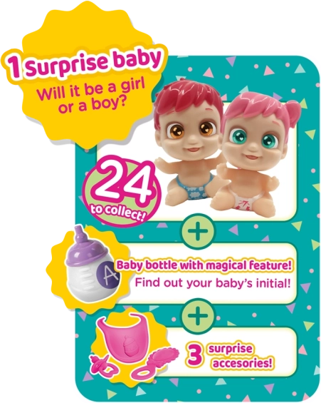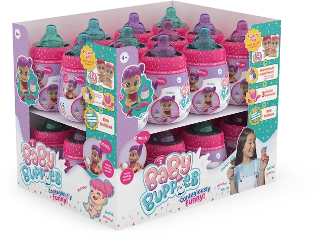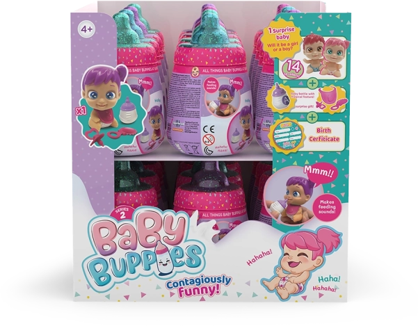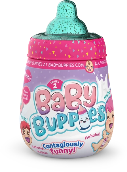 Baby Buppies to zabawne kolekcjonerskie laleczki w stylowym opakowaniu przypominającym buteleczkę. Każde niemowlę potrafi realistycznie gaworzyć i śmiać się, dzięki czemu wnosi do zabawy emocje i mnóstwo radości. Dzięki żywym kolorom i uroczemu wzornictwu dzieci szybko je pokochają.