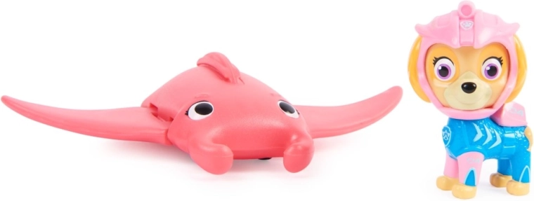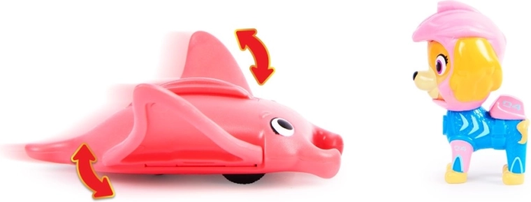 Skye w zupełnie nowej piance i jej wierna przyjaciółka – manta. Posadź Skye na płetwie na grzbiecie manty, przesuwaj mantę do przodu, aby aktywować trzepoczący ruch jej płetw i ruszaj do akcji ratunkowej. Odpowiednie od 3 lat.