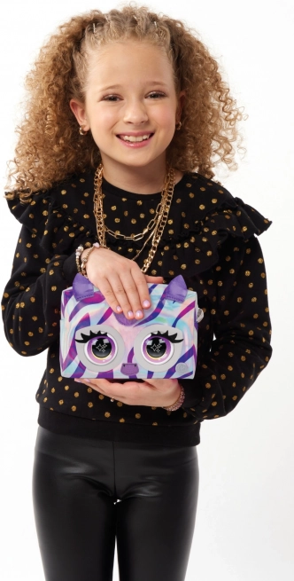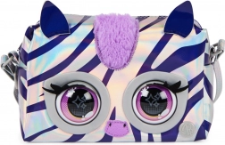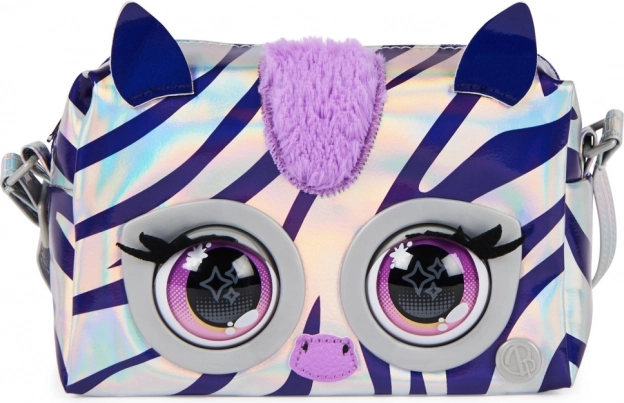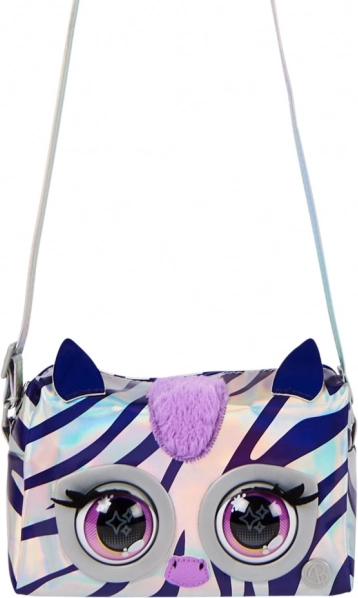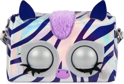 Metaliczna torebka z serii Purse Pets zachwyci dzieci swoim unikalnym stylowym designem i interaktywnymi funkcjami. Torebka jest wykonana z błyszczącej srebrnej tkaniny z holograficznymi fioletowymi paskami, które tworzą modny wygląd. Dzięki czujnikowi dotykowemu torebka reaguje mruganiem i wydaje ponad 30 różnych dźwięków, co czyni ją zabawnym towarzyszem na każdy dzień.