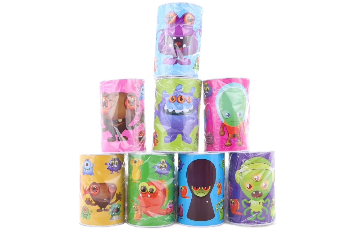 Blaszana skarbonka z motywem potworków o wymiarach ok. 15 × 10 cm. Pakowana w woreczek. Skarbonka nie ma otwierania. Wiek 3+