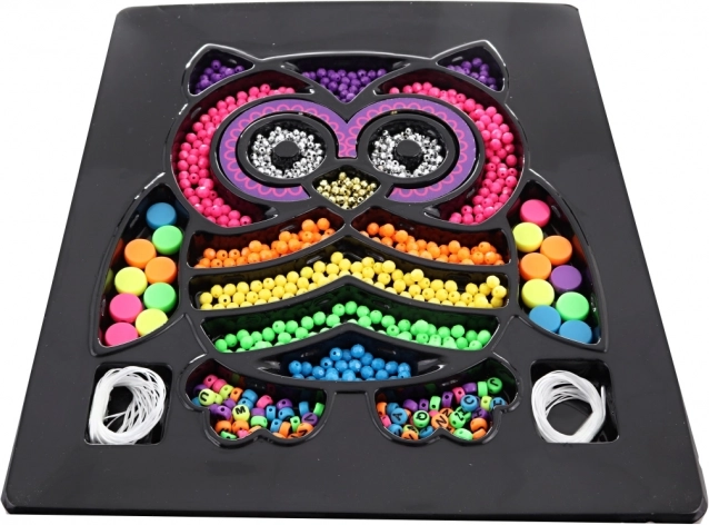 Kreatywny zestaw Plastikowe koraliki Sówka: żywe kolory, koraliki z literkami, elastyczne sznurki i praktyczny organizer. Idealny dla dzieci od 6 lat.