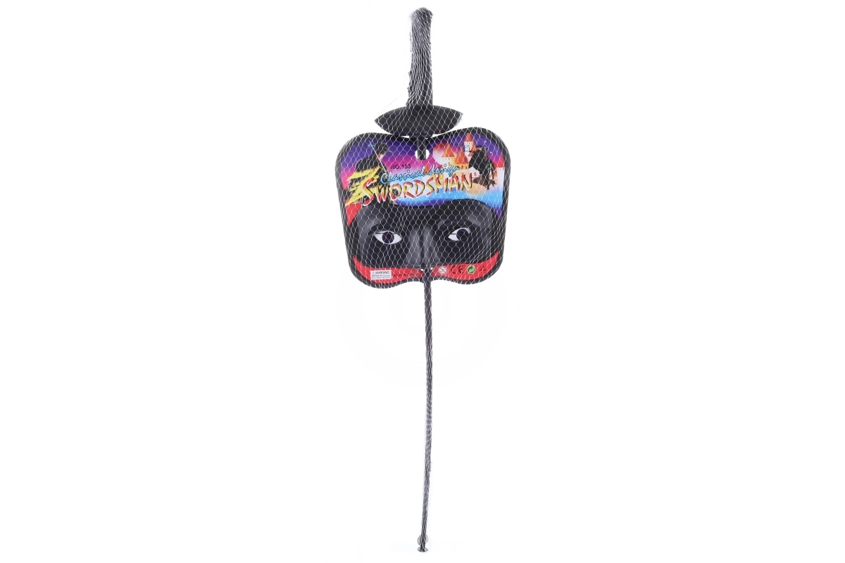 Plastowa szpada o długości ok. 60 cm z plastikową maską na gumkę o szerokości ok. 17 cm. Zapakowane w siateczkę. Wymiary opakowania ok. 60 × 18,5 × 7,5 cm. Wiek 3+