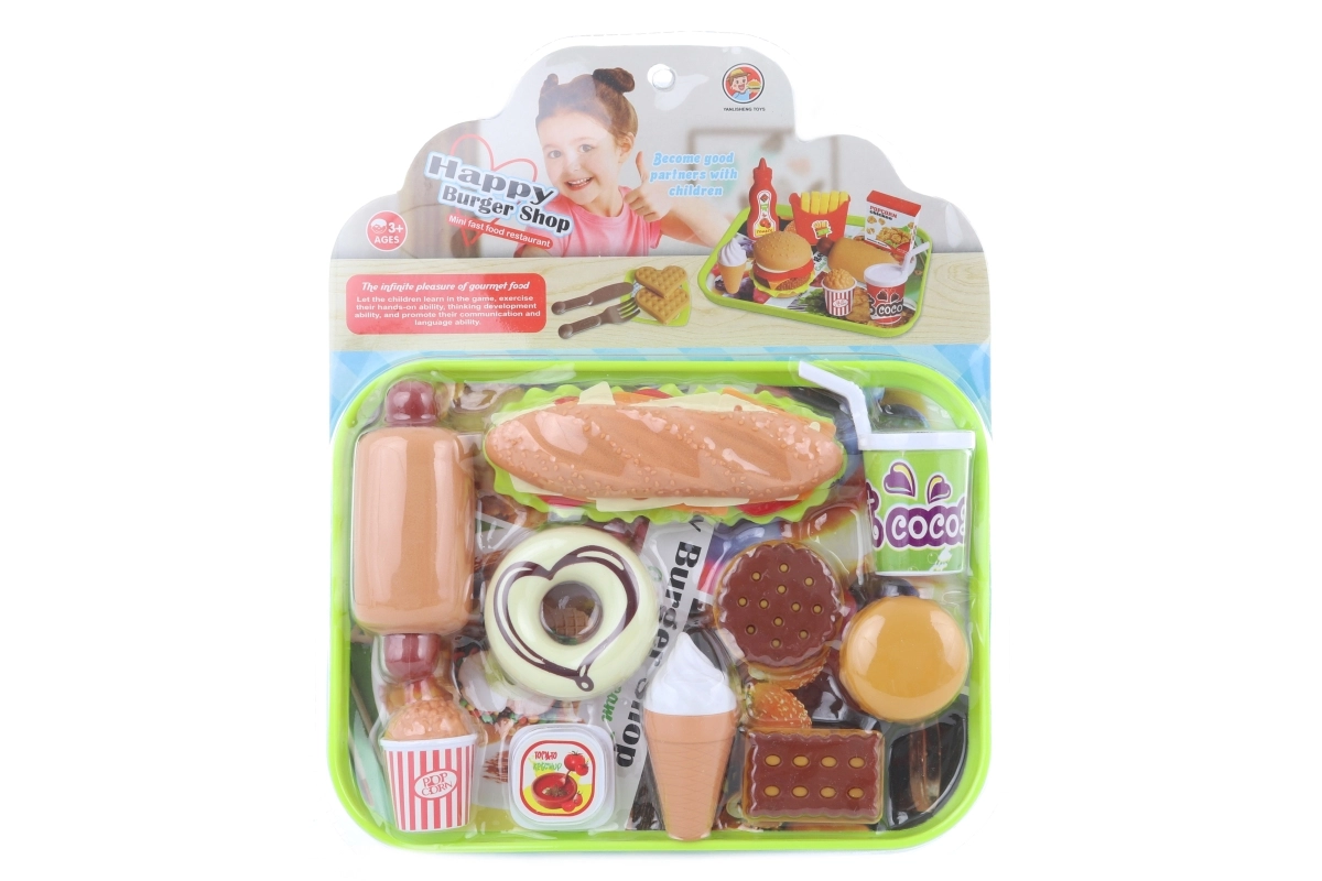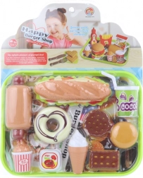 W skład zestawu wchodzą hot dog, donut, ciasteczka, lody, napój oraz inne dodatki do realistycznej zabawy w gotowanie. Zestaw to świetny pomysł na prezent i doskonale uzupełni dziecięcą kuchnię lub sklepik.