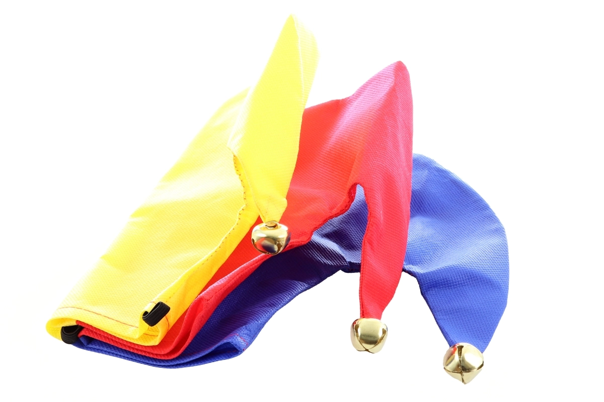 Kolorowa czapka klauna w żółtym, czerwonym i niebieskim kolorze z metalowymi dzwoneczkami dla zabawnego efektu przy każdym ruchu.