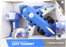 Samolot w niebiesko-białej kolorystyce wykonano z wytrzymałego plastiku i wyposażono w realistyczne detale, takie jak okienka, podwozie i skrzydła. W zestawie znajduje się śrubokręt oraz dziecięca wiertarka, które służą zarówno do montażu, jak i jako moduł napędowy. Złożony model ma wymiary około 26 × 25 × 14 cm i świetnie leży w dziecięcych dłoniach.