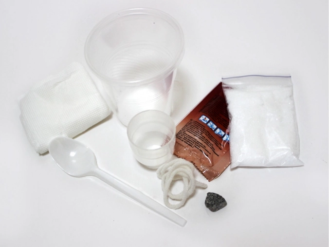- fosforan amonu (dihydrogenofosforan amonu), zielony barwnik spożywczy, zlewka, 2 plastikowe kubeczki, plastikowa łyżeczka, włóczkowe włókno, chusteczka papierowa, kamyk, polska instrukcja
