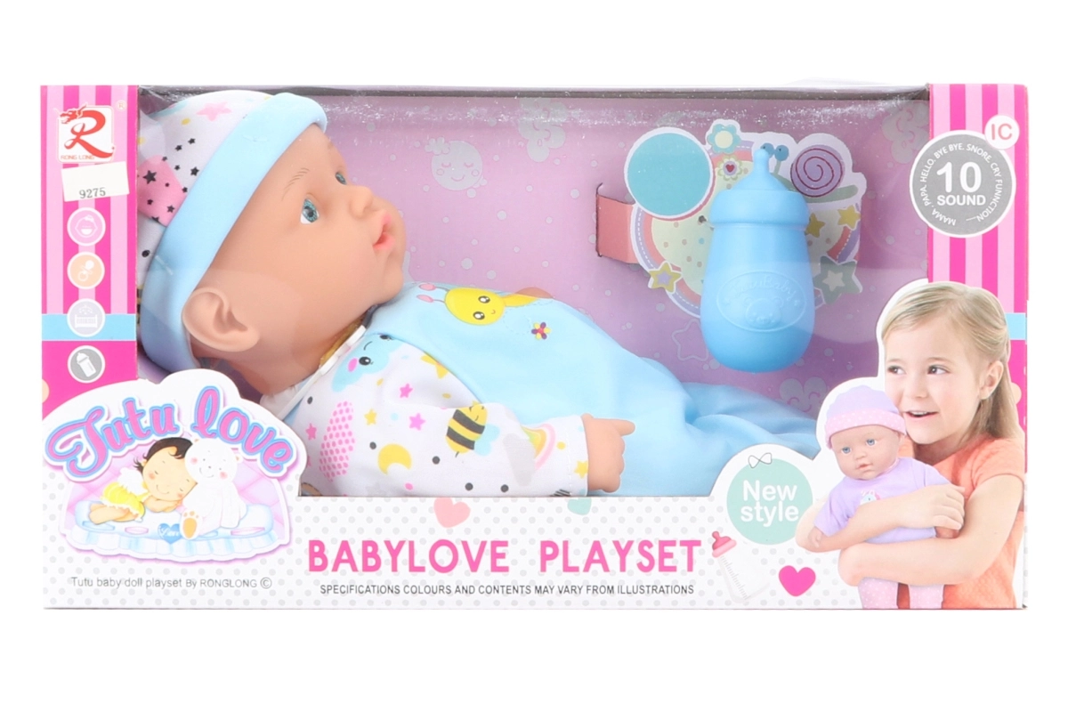 Uroczy bobas z miękkim, szmacianym ciałem ucieszy każde dziecko. Po włożeniu baterii wydaje 10 różnych dźwięków, w zestawie znajduje się butelka do zabawy w karmienie. Baterie AG13 są dołączone do opakowania, więc zabawa może zacząć się od razu. Idealny prezent dla dzieci od 3 lat.