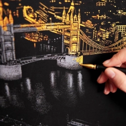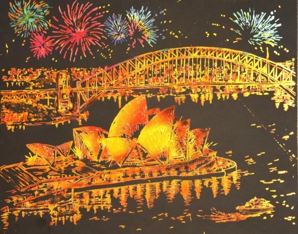 Odkryj magię techniki wydrapywania: pod czarną warstwą kryje się złote tło, które z każdego wydrapanego ruchu tworzy kontrastowy, elegancki efekt. Motyw ikonicznej Opery w Sydney w nocnej odsłonie ucieszy początkujących i zaawansowanych, a gotowy obrazek stanie się oryginalną dekoracją.