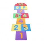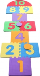 Piankowe puzzle w formie gry w klasy. Zawiera 10 elementów. Wymiary opakowania ok. 56 × 30 × 6,5 cm. Wiek 3+
