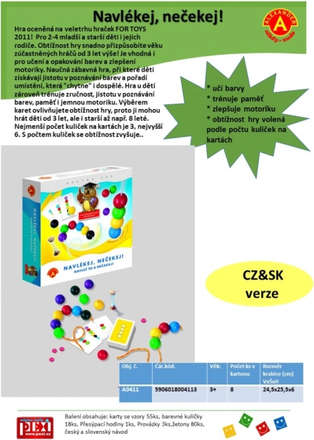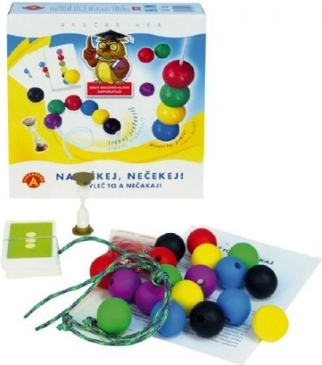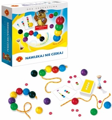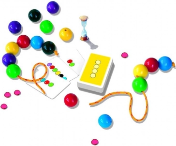 Zasady są proste: odwracasz kartę wzoru, zapamiętujesz kolejność kolorowych kulek i jak najszybciej nawlekasz je na sznurek. Klepsydrę możesz wykorzystać dla bardziej emocjonującej rozgrywki lub pominąć ją przy młodszych dzieciach. Za prawidłowo umieszczone kulki zdobywasz żetony, a wygrywa gracz z największą liczbą punktów.