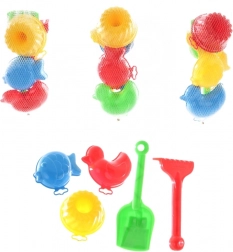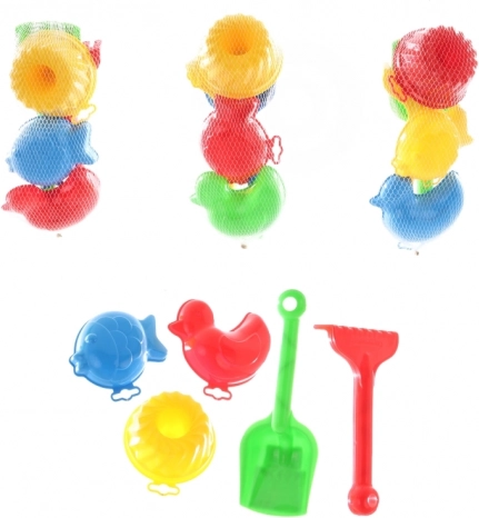 Zabawny zestaw do piasku dla małych budowniczych zawiera łopatkę, grabki i trzy foremki. Lekki, łatwy do przenoszenia i zapakowany w siateczkę – idealny na plac zabaw i nad morze.