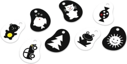 Zestaw 10 wytrzymałych tabliczek połączonych plastikowym kółkiem jest idealny w domu i w podróży – nic się nie zgubi, a dziecko łatwo je chwyci.