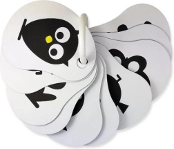 Dzięki plastikowemu kółku karty trzymają się razem, łatwo je przenosić, a niemowlę może bezpiecznie je chwytać. Delikatny, lecz wytrzymały papier jest przyjemny w dotyku i odporny na częste oglądanie. Gra powstała pod opieką merytoryczną psycholożki z Uniwersytetu Warszawskiego, Aleksandry Pietrowskiej, i należy do lubianej serii Sóweczka mądra główka.