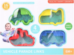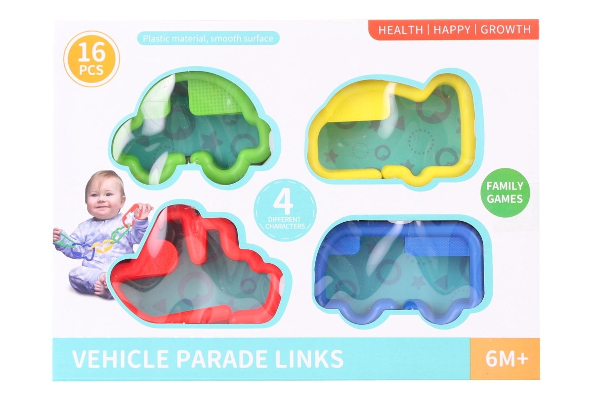 Kolorowy plastikowy łańcuch łączący z elementami w kształcie środków transportu do zawieszenia na wózku lub foteliku samochodowym. Wspiera motorykę małą, percepcję wzrokową i rozwój sensoryczny. Opakowanie zawiera 16 elementów. Odpowiednie od 6 miesięcy.