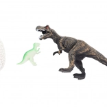 - Figurka dinozaura (T‑Rex) i pęknięte jajko