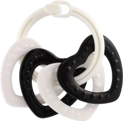 Stylowy zestaw czarno-białych kółeczek z czterema kształtami to idealna pierwsza zabawka dla niemowlęcia. Kontrastowe wzory wspierają stymulację wzrokową, zróżnicowane faktury rozwijają dotyk, a lekkie wykonanie ułatwia chwyt małymi rączkami. Odpowiednie od urodzenia.