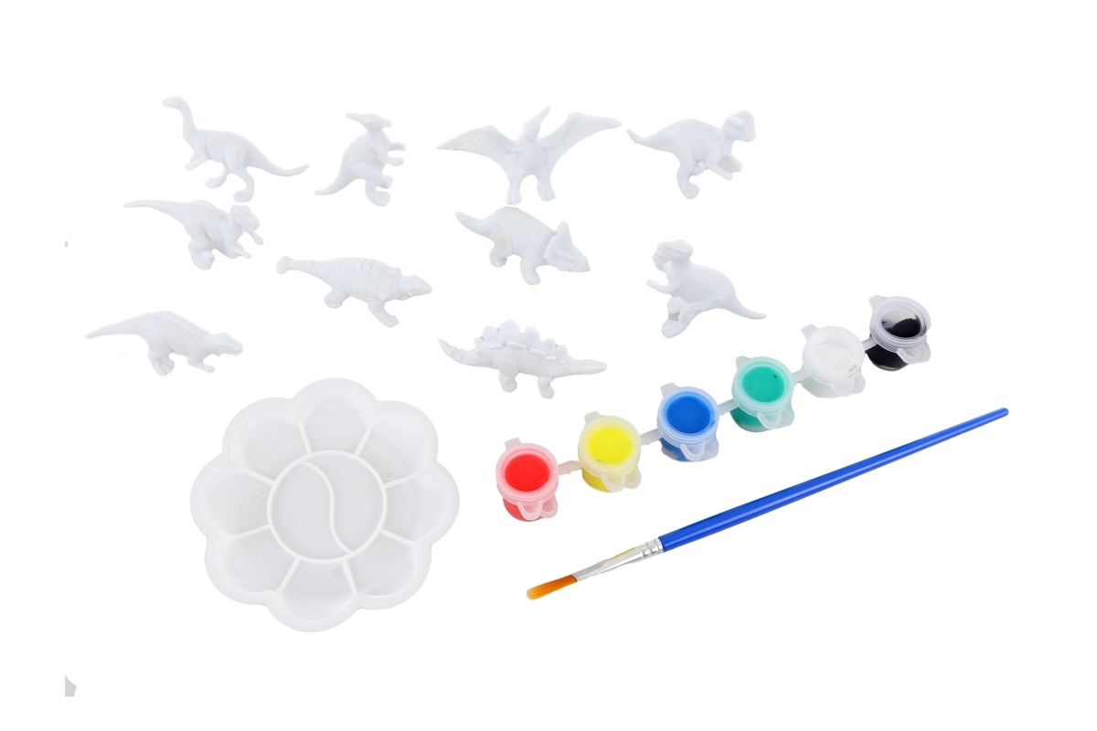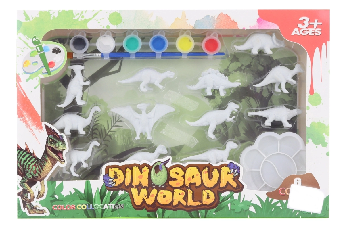 Zestaw zawiera dinozaury 3D, 6 farb, pędzelek i paletę – dzieci mogą zacząć tworzyć od razu, bez dokupywania akcesoriów.