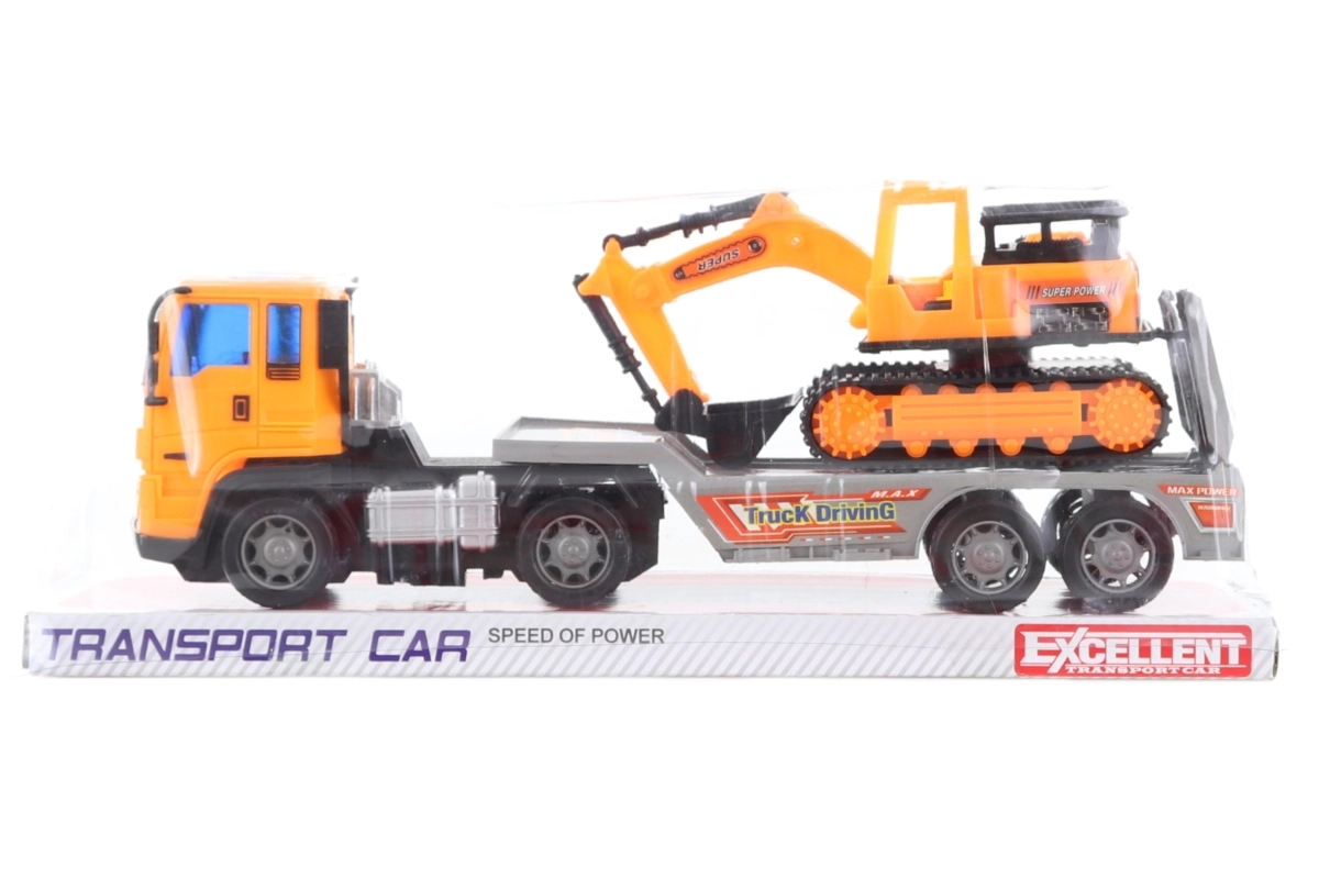 Plastikowa ciężarówka z koparką o wymiarach ok. 28 × 10,5 × 8 cm. Wymiary opakowania ok. 32 × 13 × 9 cm. Wiek 3+