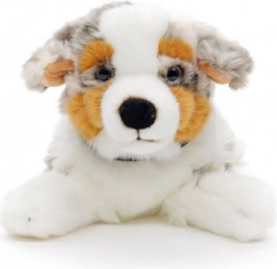 Uroczy pluszowy piesek rasy owczarek australijski w pozycji leżącej ucieszy dzieci i miłośników zwierząt. Jest miękki, puszysty i dzięki wykonaniu eco-friendly przyjazny dla środowiska. Idealny do przytulania, zabawy oraz jako dekoracja do pokoju dziecięcego.