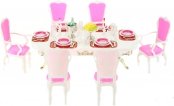 Stwórz doskonałą kolację dla lalek z kompletnym zestawem Glorie. Duży stół i sześć krzeseł zapewniają dużo miejsca dla gości, a dopracowane detale nadają zabawie realistycznego charakteru. Zestaw zaprojektowano z myślą o łatwym użytkowaniu przez dzieci i wspiera wyobraźnię, komunikację oraz motorykę małą.
