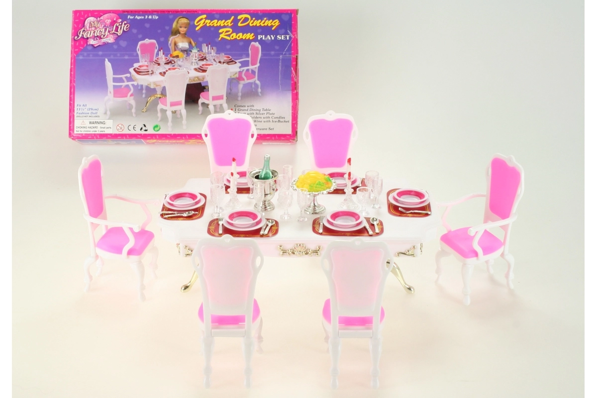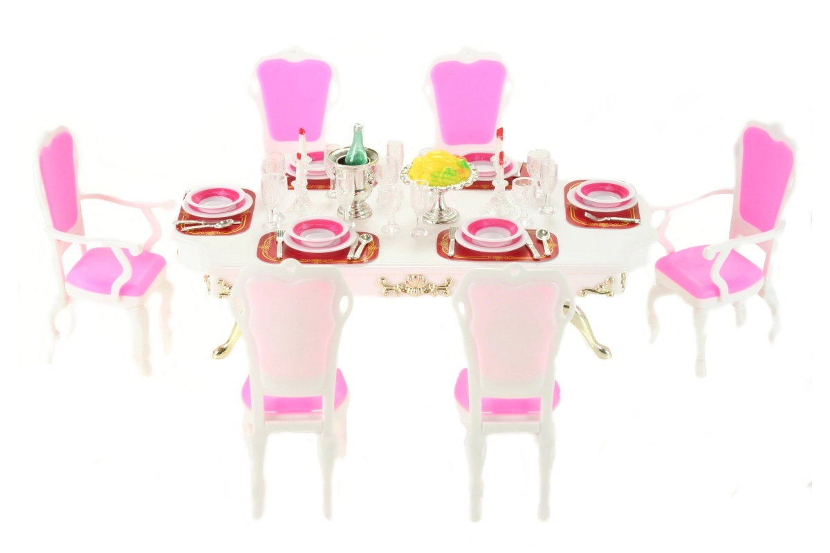 Stylowy zestaw Glorie do lalkowego biesiadowania zamieni każdy pokoik w elegancką jadalnię. Zawiera duży plastikowy stół, 6 krzeseł (2 z podłokietnikami) oraz bogate nakrycie stołu, w tym kieliszki, talerze i sztućce. Idealny do kreatywnej zabawy dla dzieci od 3 lat.