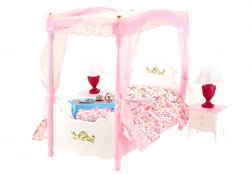 Zafunduj lalkom luksusowy sen dzięki eleganckiemu łóżku z baldachimem GLORIE. Zestaw zawiera łóżko z narzutą i poduszeczką, dwie szafki nocne oraz dwie lampki, które po przekręceniu cylindra zaświecą. Idealne do kreatywnej zabawy i stylowych domków dla lalek.