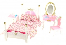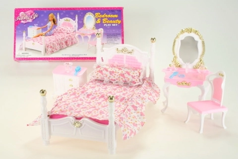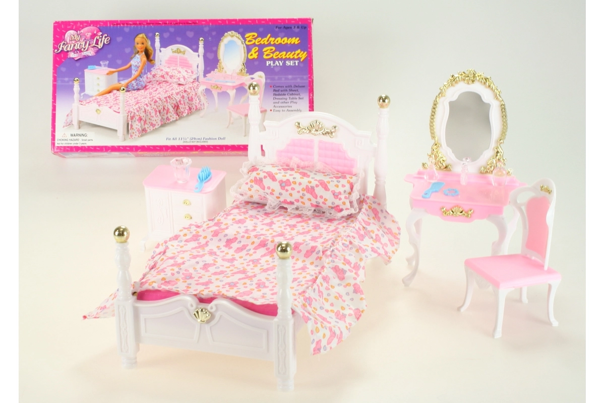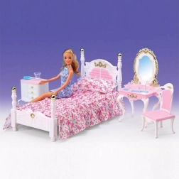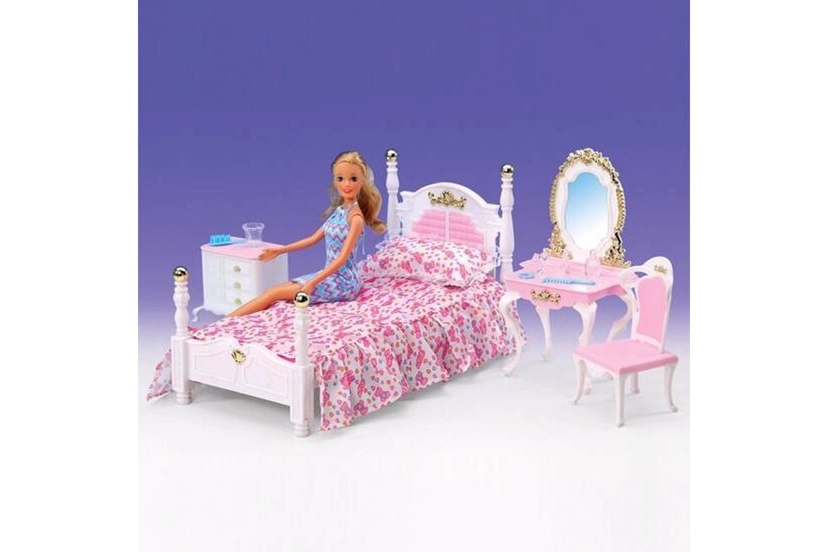 Glorie Sypialnia zawiera plastikowe łóżko o wymiarach ok. 16 cm x 34 cm x 18 cm z narzutą i poduszką, toaletkę o wymiarach ok. 13 cm x 8 cm x 22 cm z akcesoriami dla lalek – grzebień, bransoletka, szczotka i buteleczki, fotel ok. 7 cm x 7 cm x 13 cm, stolik nocny ok. 8,5 cm x 6 cm x 8 cm. Lalka nie jest częścią zestawu. Wiek 3+