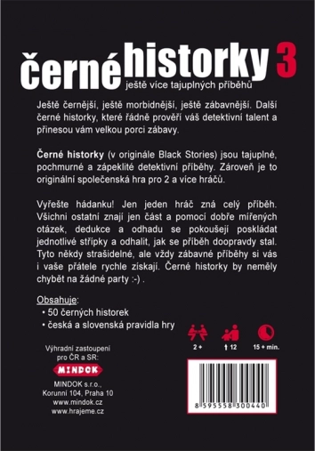 Czarne historie 3 przynoszą jeszcze czarniejsze, bardziej makabryczne i zabawniejsze historie, które zarówno rozbawią, jak i porządnie rozruszają twoje szare komórki. Jeden gracz zna cały przypadek, pozostali za pomocą pytań, dedukcji i logiki próbują poskładać fragmenty i rozwikłać zagadkę. Idealne na wieczory ze znajomymi, rodzinne spotkania oraz jako lodołamacz na imprezie.