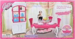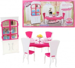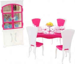 Glorie zestaw jadalniany dla lalek oferuje kompletną jadalnianą aranżację z eleganckim plastikowym stołem, czterema krzesłami i szafką, uzupełnioną o talerze, szklanki, sztućce oraz dekoracyjne dodatki.