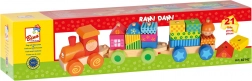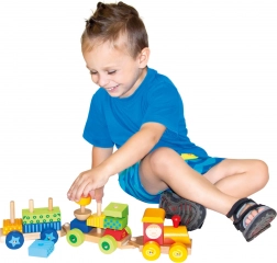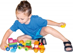 Wielofunkcyjny drewniany pociąg to nie tylko zabawka na ciągnięcie, ale również układanka, która pozwala dzieciom rozwijać ich kreatywność. Część pociągu stanowią trzy podwozia i 18 różnych klocków, które można układać według wyobraźni.