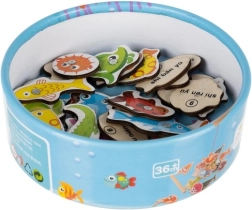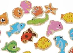 Zestaw zawiera wszystko, co potrzebne: 22 drewniane zwierzątka z magnesem, 2 drewniane wędki oraz okrągły pojemnik, który posłuży jako „akwarium”. Bezpieczne, gładkie krawędzie i przewaga naturalnego materiału, jakim jest drewno, czynią z niego bezpieczną i trwałą zabawkę dla dzieci od 3 lat. Doskonały do zabawy indywidualnej i grupowej, rozwoju komunikacji i współpracy.