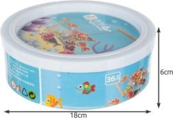 Okrągły pojemnik jako improwizowane akwarium oraz 22 morskie stworzenia z magnesami zapraszają do zabawy, która rozwija koordynację i wyobraźnię.