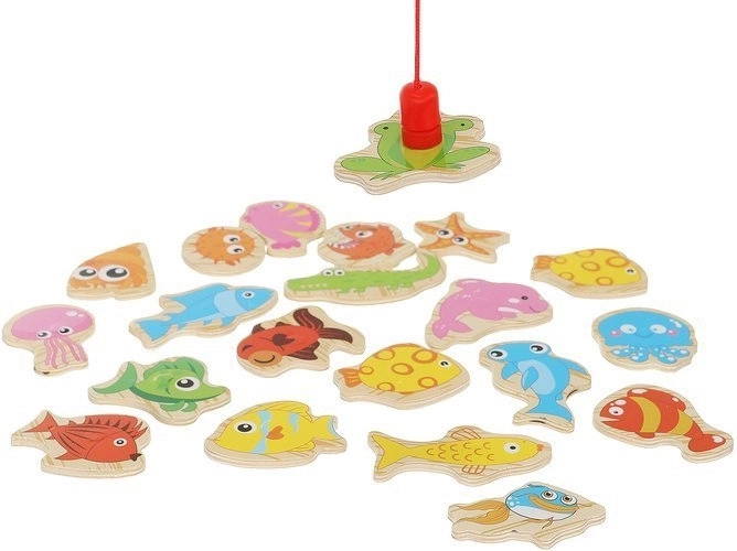 Cudownie kolorowa magnetyczna gra w łowienie rybek z wysokiej jakości drewna ucieszy każdego małego odkrywcę. Wspiera motorykę małą, logiczne myślenie oraz rozpoznawanie kształtów i kolorów. W zestawie znajduje się okrągły „zbiornik”, 22 morskie zwierzątka z magnesem oraz 2 drewniane wędki do świetnej zabawy także przy złej pogodzie.