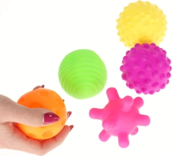 Każda piłeczka ma unikalną powierzchnię (małe i duże wypustki, żebrowanie, rowki, „jeżyk”), która wspiera zmysł dotyku i ciekawość dziecka.
