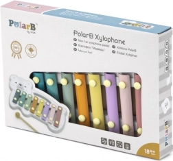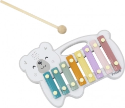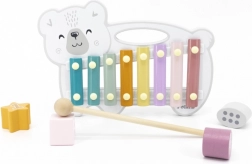Drewniany ksylofon w kształcie niedźwiedzia polarnego łączy zabawną estetykę z funkcjonalnym instrumentem muzycznym. Pastelowo kolorowe metalowe listwy tworzą przyjemne tony po uderzeniu drewnianą pałeczką, naturalnie zachęcając dzieci do eksperymentowania z dźwiękami i rytmem.